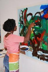 « J’aime l’huile pour sa lenteur à sécher : elle me laisse le temps d’observer, de revenir, de remanier. Ce temps suspendu (…) m’offre un espace pour faire dialoguer mes émotions avec la matière, pour ajuster, explorer, affirmer. »